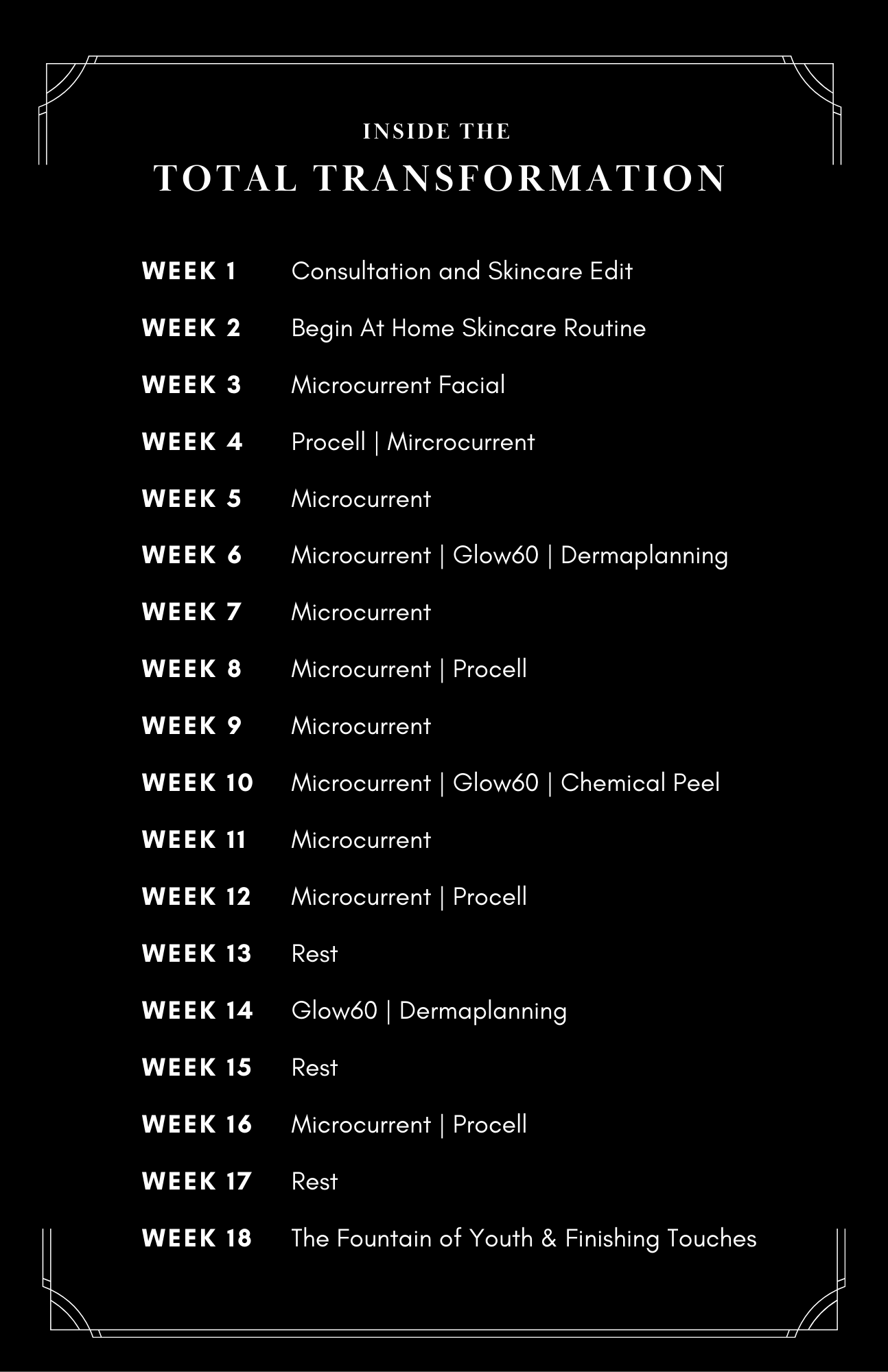 When The Total Transformation series ends, we’ll transition you into a personalized, lower-maintenance plan designed to preserve your lift, tone, and luminosity long-term. Think of it as moving from transformation into upkeep—so your results stay beautifully maintained.
